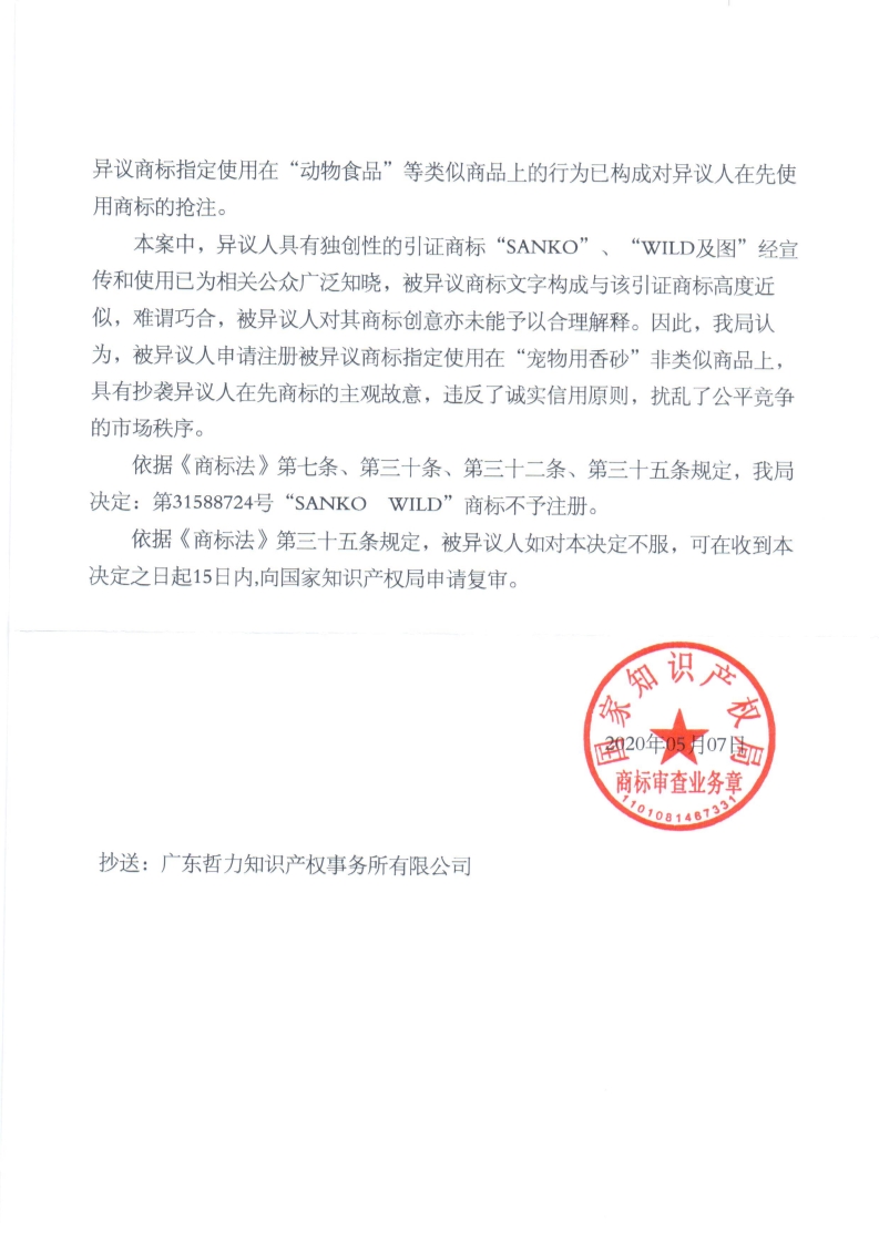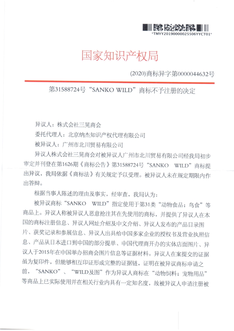 株式会社三晃商会委托我司对广州市北川贸易有限公司刊登在第1626期《商标公告》第31588724号"SANKO WILD"商标提出异议,最终我司对"SANKO WILD"商标异议成功!