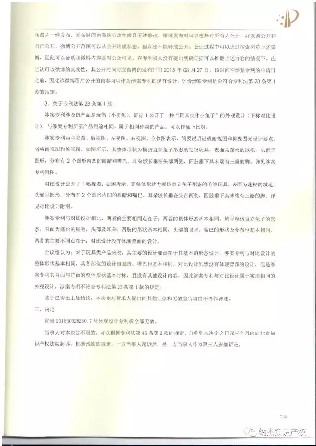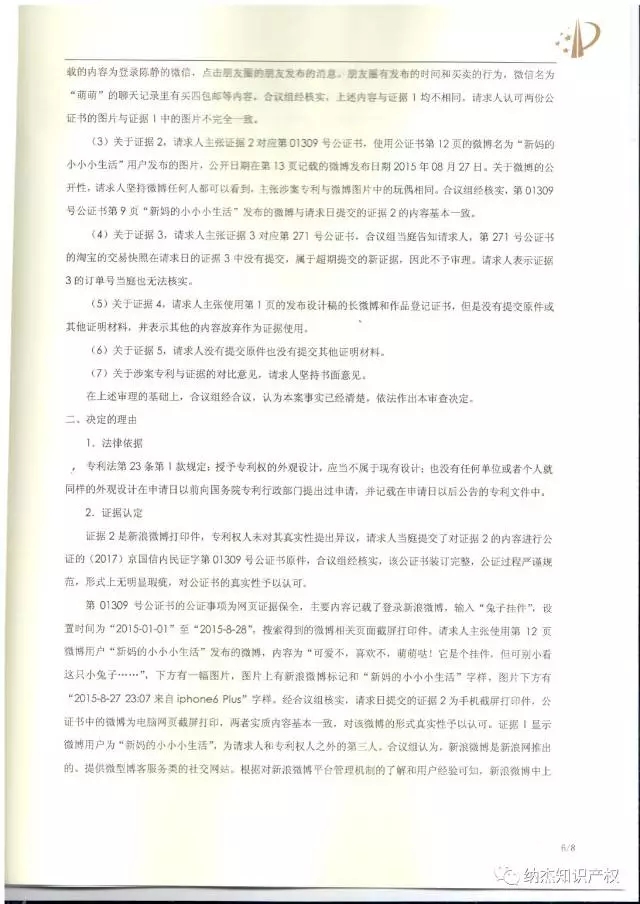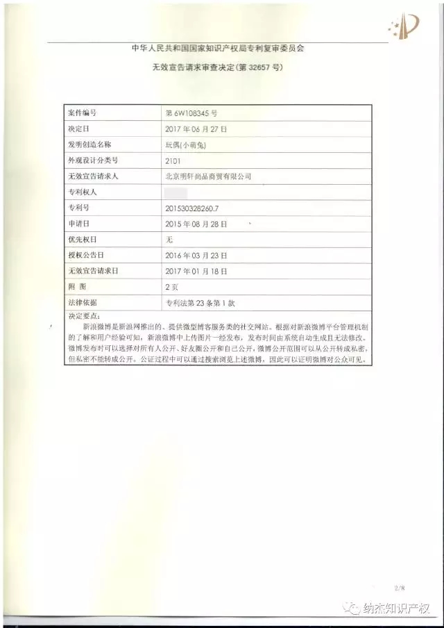“公开”是指存在这样一种状态,即任何人如果想得到就能得到相应技术内容或者外观设计的内容的状态。以此为出发点,我具体论述了微博属于公开,诚如在无效决定中合议组所强调的那样“新浪微博是新浪网推出的、提供微型博客服务类的社交网站,根据对新浪微博平台管理机制的了解和用户经验可知,新浪微博中上传图片一经发布,发布时间由系统自动生成且无法修改。微博发布时可以选择对所有人公开、好友圈公开和自己公开,微博公开范围可以从公开转成私密,但私密不能转成公开。公证过程中可以通过搜索浏览上述微博,因此可以证明该微博内容是对公众可见的。”因而复审委采信了证据2,并由此无效掉了诉争专利。