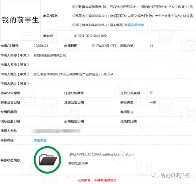 目前,“我的前半生”商标处于等待实质审查阶段。