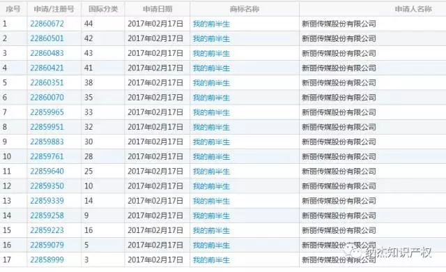 据了解《我的前半生》这部剧是新丽电视文化投资有限公司出品的,于2017年7月4日在东方卫视、北京卫视首播。而小纳在商标局官网上查询到,早在2017年2月17日新丽传媒股份有限公司就将“我的前半生”申请注册商标了,商标注册类别高达17个。