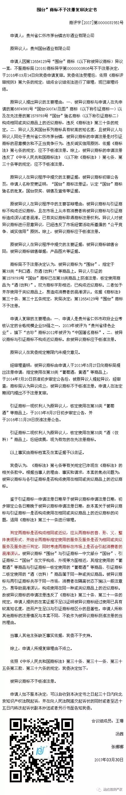 “围台”商标不予注册,理由:商标近似“国台”!