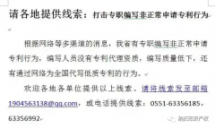 - 安徽省征集线索:打击专职编写非正常申请专利行为! 2021-04-21 安徽省征集线索:打击专职编写非正常申请专利行为! 查看详细