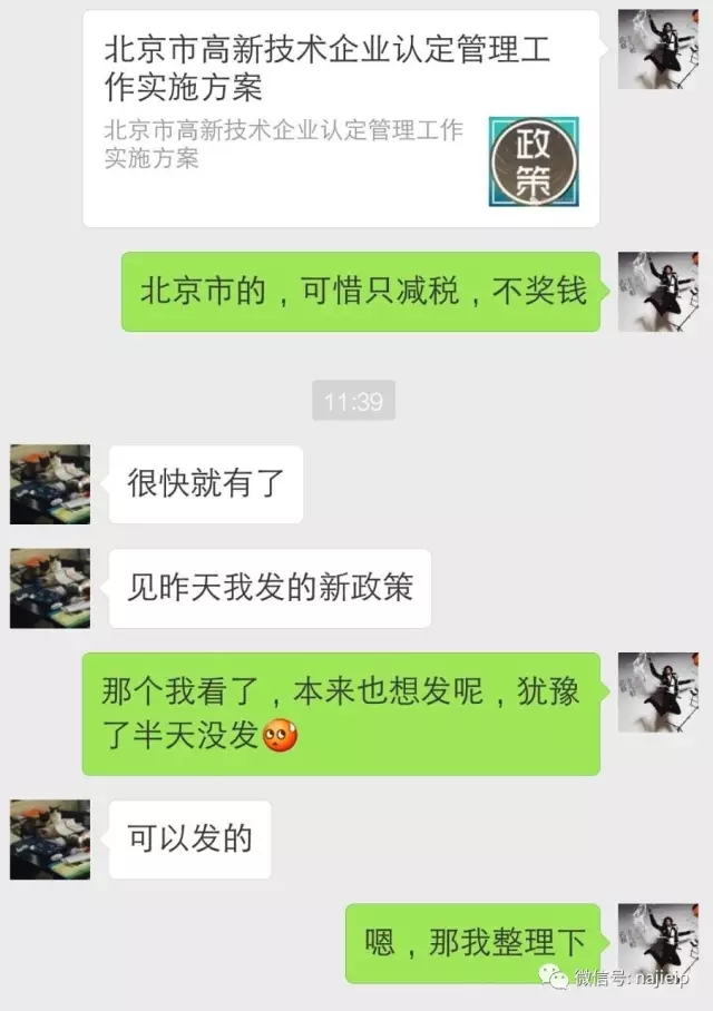昨天小纳发了篇《北京市高新技术企业认定管理工作实施方案》并把它发到了我们纳杰知识产权的工作群中,且写道北京的高新技术企业认定企业只享受优惠政策,不奖励钱。结果正是这句话,把Boss给炸出来了,来,详情见图片。