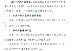 河南安阳:通过知识产权贯标企业,一次性奖励15万 2017-11-22 河南省安阳市制定的《安阳市知识产权专项资金使用管理办法》(安财教〔2016〕17号)中,对于企业开展知识产权贯标工作有明确奖励标准。 查看详细