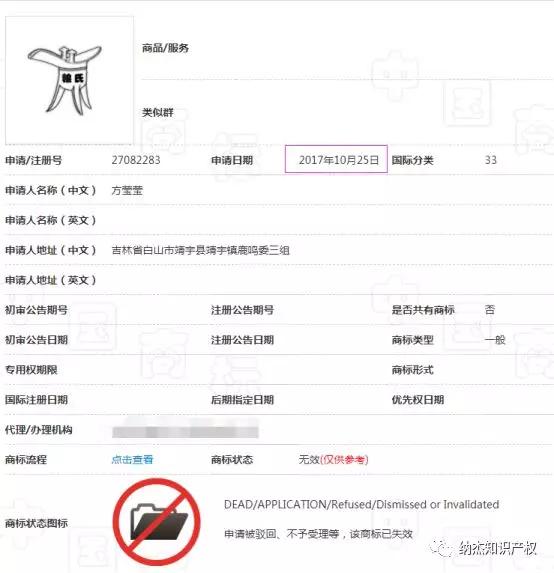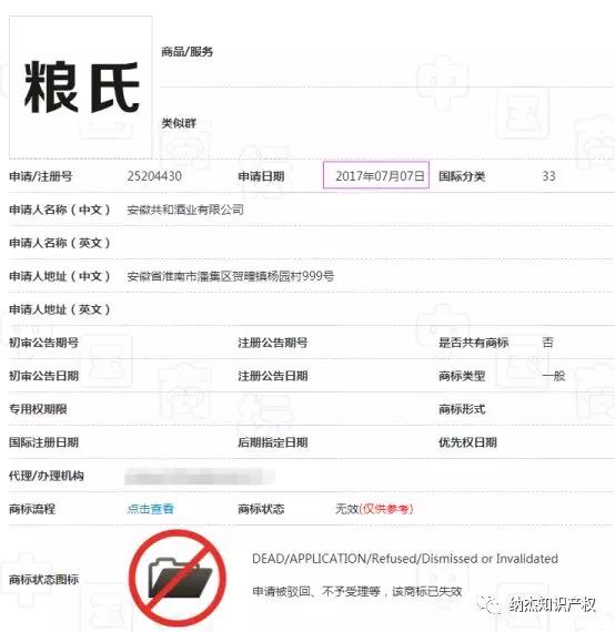 举个例子,本文“粮氏酱酒”的申请日期是2017年09月01日,在2017年10月25日有一位叫做方莹莹的人申请注册了“粮氏”商标,结果就是惨被驳回。我分析该商标驳回的很大原因就是与“粮氏酱酒”近似,但不能100%确定,因为在“粮氏酱酒”商标注册成功前,还有一个“粮氏”商标注册失败了(就“粮氏酱酒”夹在中间注册成功了)。