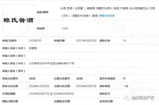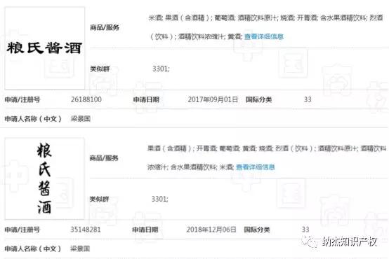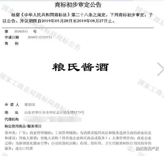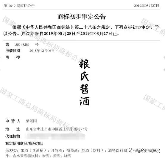 还有梁景国还注册了第35类的“粮氏酱酒”商标,目前也是已经初审公告。