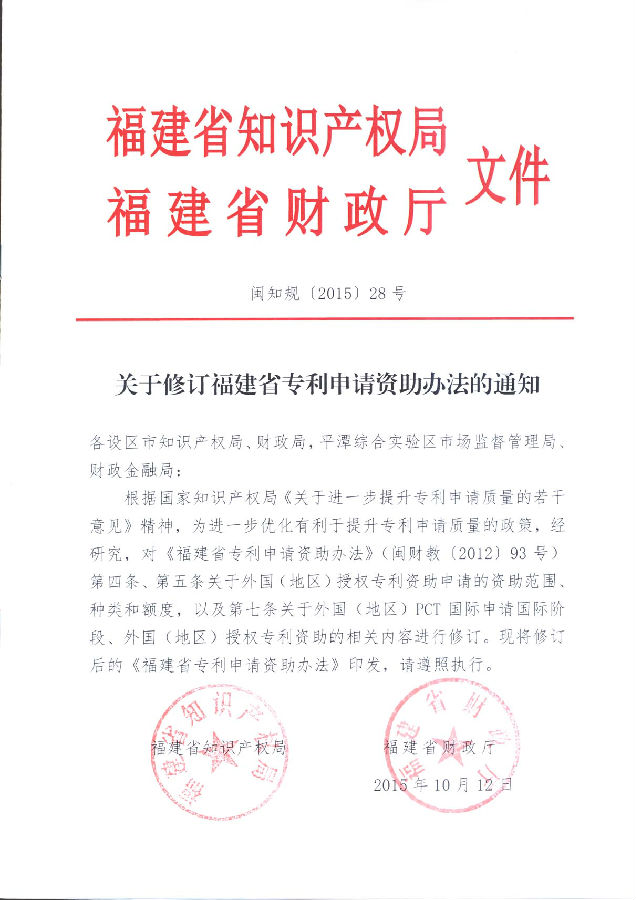 福建省专利申请资助奖励政策 2017-12-28 福建省下发了《关于修订福建省专利申请资助办法的通知》,明确规定了福建省专利申请资助的奖励标准。 查看详细